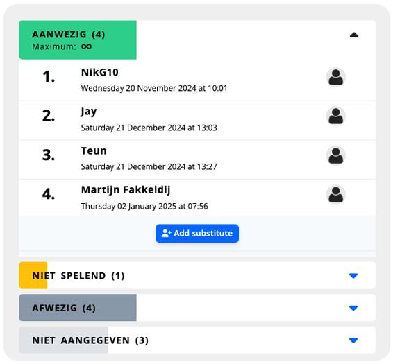 De software houdt bij wie er aanwezig en afwezig zijn. En je kunt externe invallers toevoegen