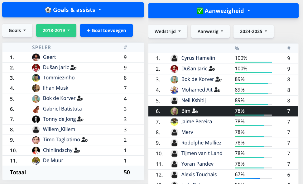 Doelpunten en assists bijhouden en een taken schema opstellen voor fluitbeurten en wasbeurten.